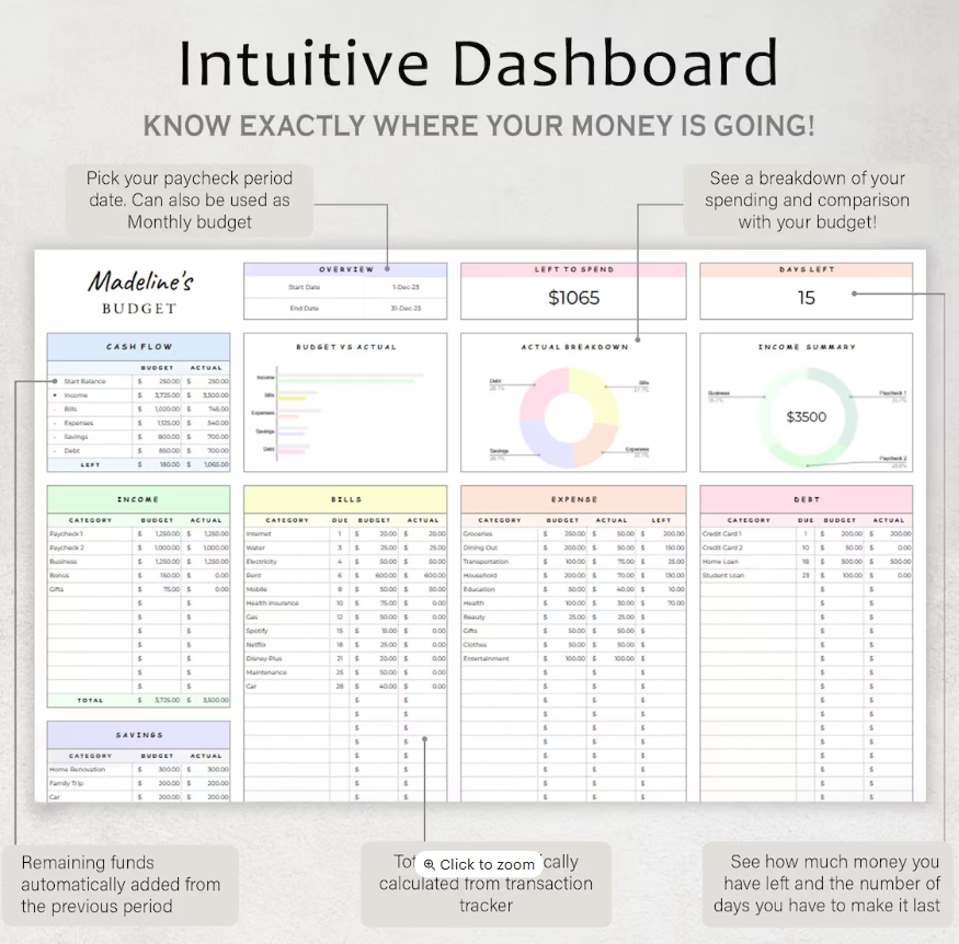 Take control of your money with this easy-to-use Budget by Paycheck Spreadsheet! Perfect for beginners and finance enthusiasts, this tool helps you track your income, expenses, bills, debt, and savings on a weekly, biweekly, or monthly basis.